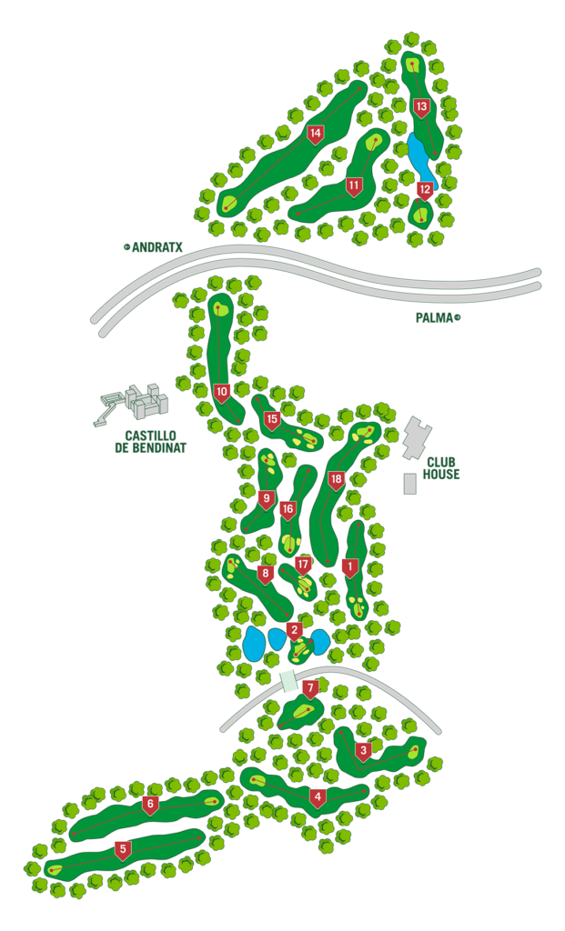 Inaugurado en 1986 (con 9 hoyos) y ampliado en 1995, el Real Golf de Bendinat tiene 5.660 metros de largo con 18 hoyos (Par 70). Diseñado por Martin Hawtree, el campo del Real Golf Bendinat cautiva a sus jugadores gracias a la combinación que ofrece entre valle y montaña, con hoyos que necesitan una estrategia interesante para obtener buenos resultados.