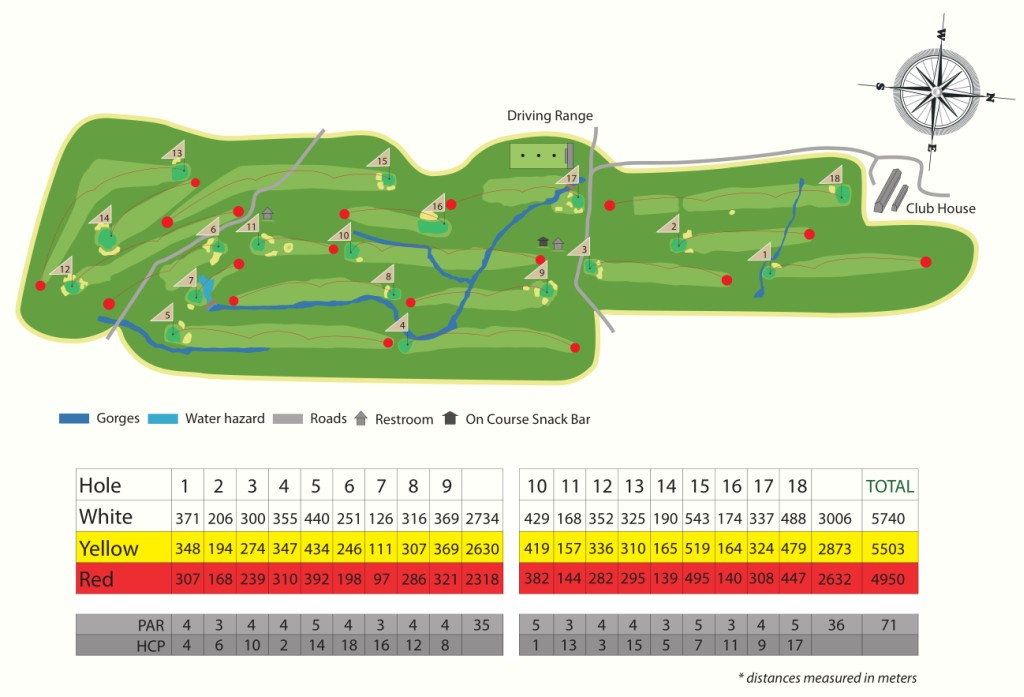 Les ravins entrent en jeu sur plusieurs trous. Le numéro 4 est l’un des plus difficiles et nécessite d’atteindre le green au deuxième coup, avec des hors limites à gauche et des pentes à droite. Le parcours est agrémenté d’arbres imposants qui ombragent le sentier par tronçons.